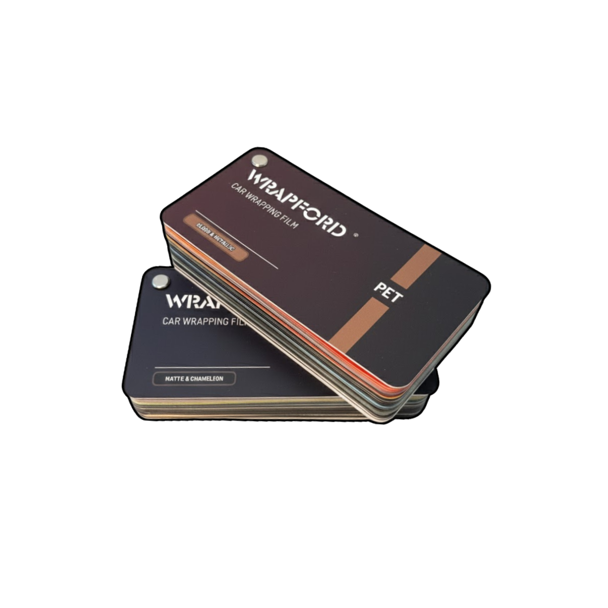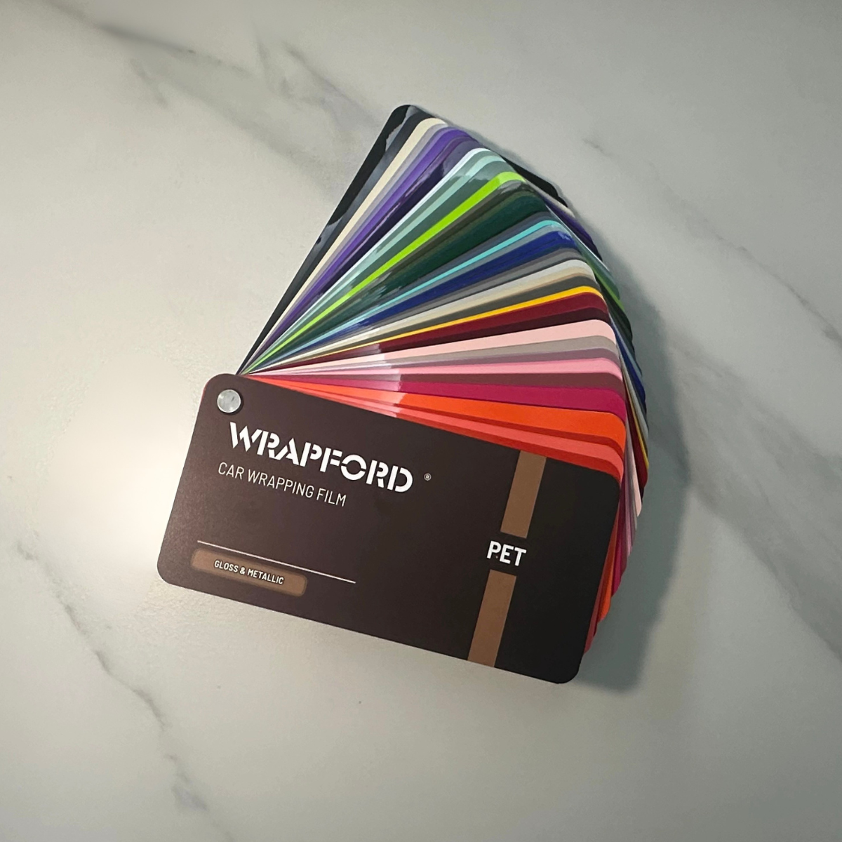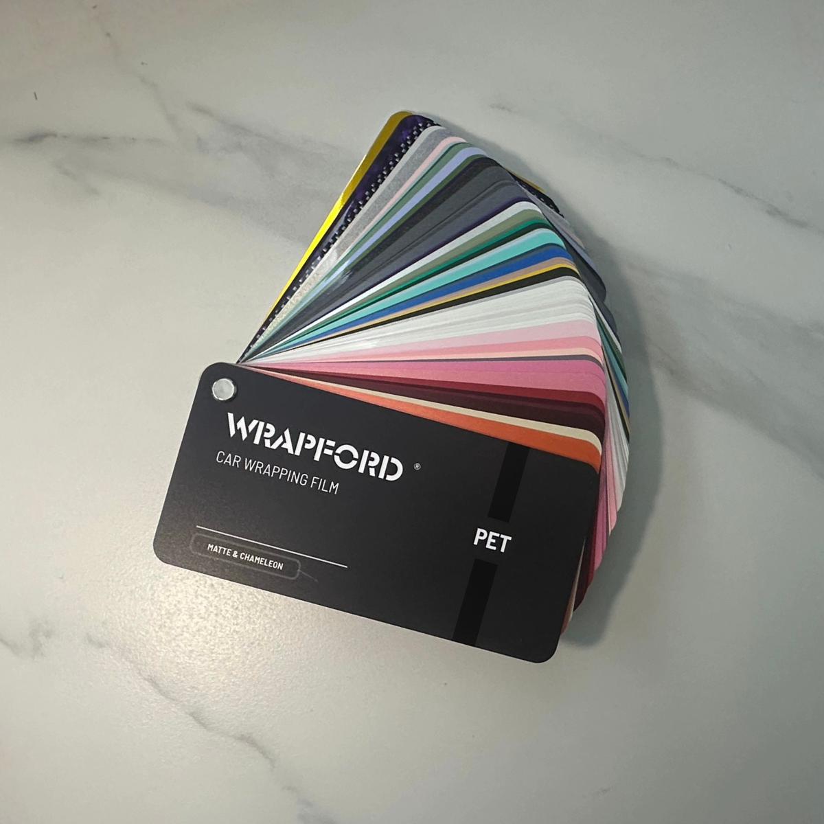 WRAPFORD PET-baserte fargeprøvesett er utviklet for å gi wrapping-verksteder, montører og utstillingslokaler en omfattende og pålitelig fargereferanse for profesjonell bruk. Produsert med de samme PET-baserte vinylfoliematerialene som våre produksjonsfilmer, gjengir hver prøve nøyaktig ekte farge, overflate og tekstur.